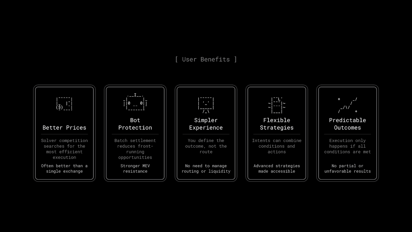 The user-facing difference is real. Solver competition consistently finds better prices than any single exchange. Batch settlement systems like CoW's make front-running structurally harder by settling trades at a uniform price. You don't need to understand liquidity pools, gas optimization, or routing logic. And because your intent only settles if every condition is met, you don't end up with transactions that went through but delivered a bad outcome because conditions shifted mid-execution.
