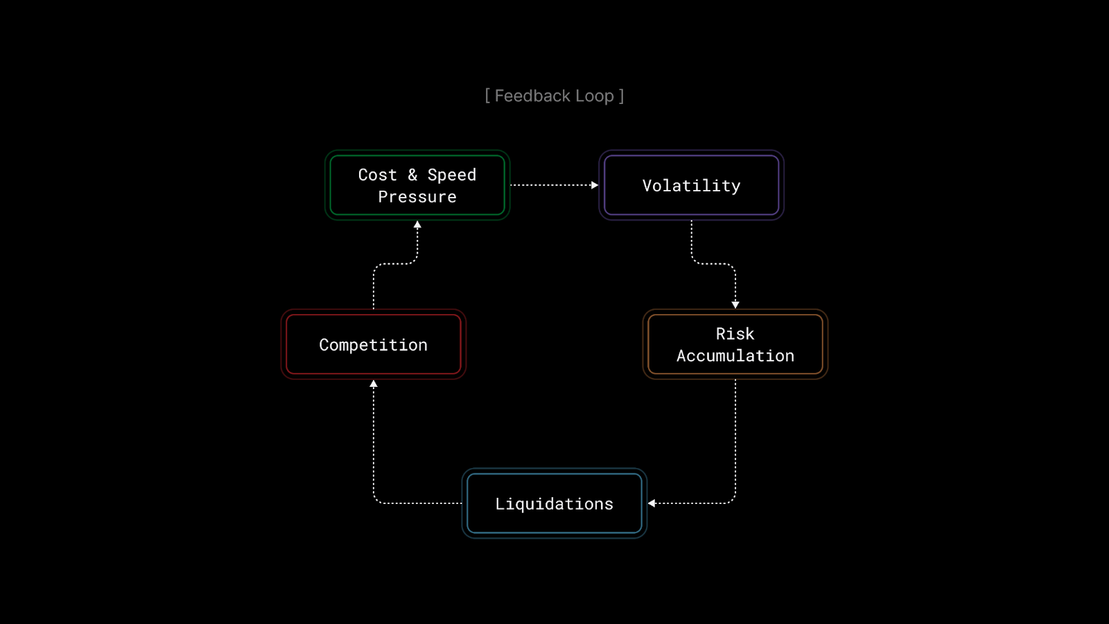 What emerges is a closed loop: volatility creates risk, risk triggers liquidations, liquidations intensify competition, and competition feeds volatility.