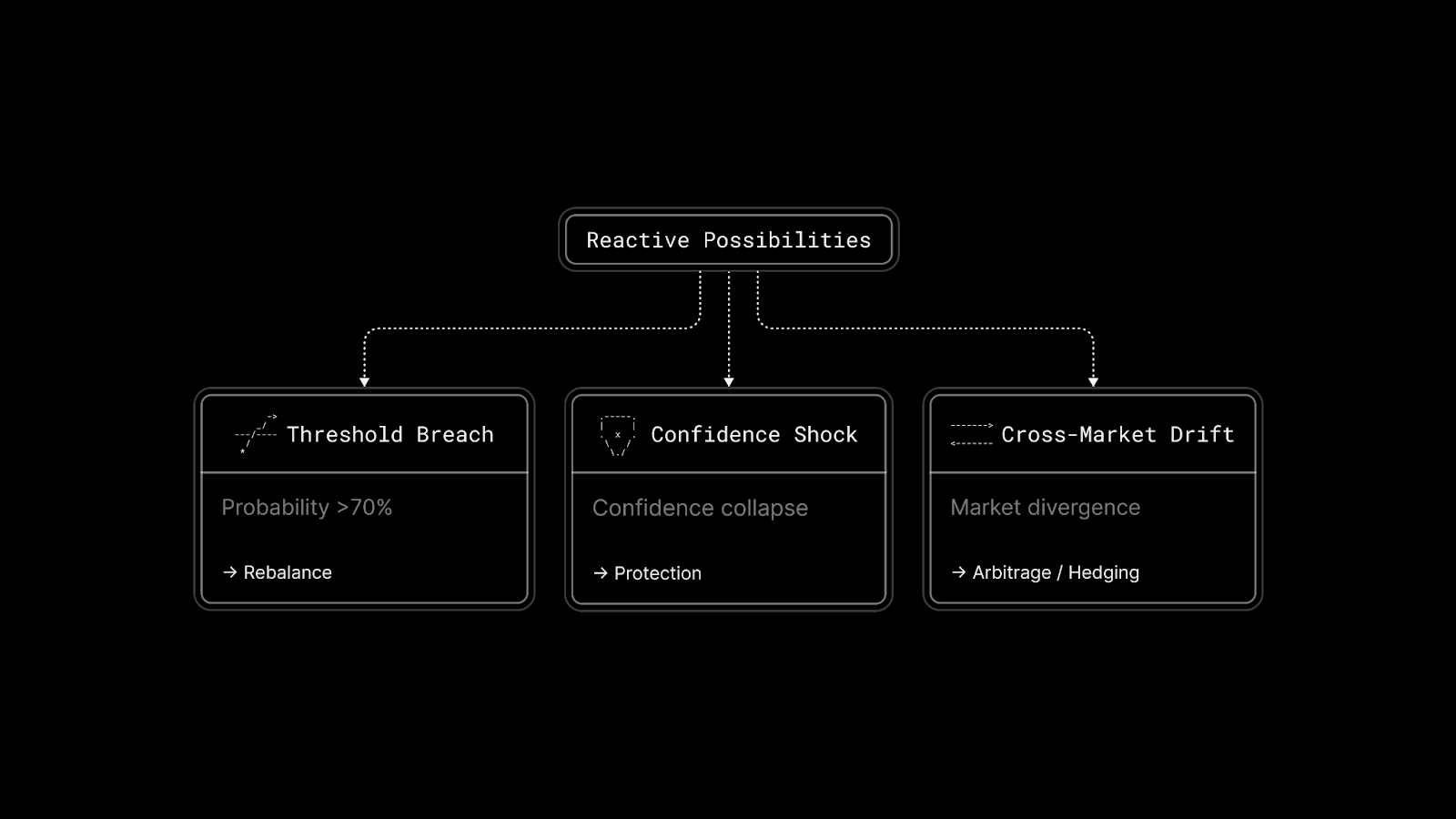 In this model, prediction markets remain neutral and passive by design. The reaction happens outside the protocol, where users define how their capital should respond to belief tweaks: rebalancing, hedging, arbitraging, or reallocating risk automatically as probabilities move.