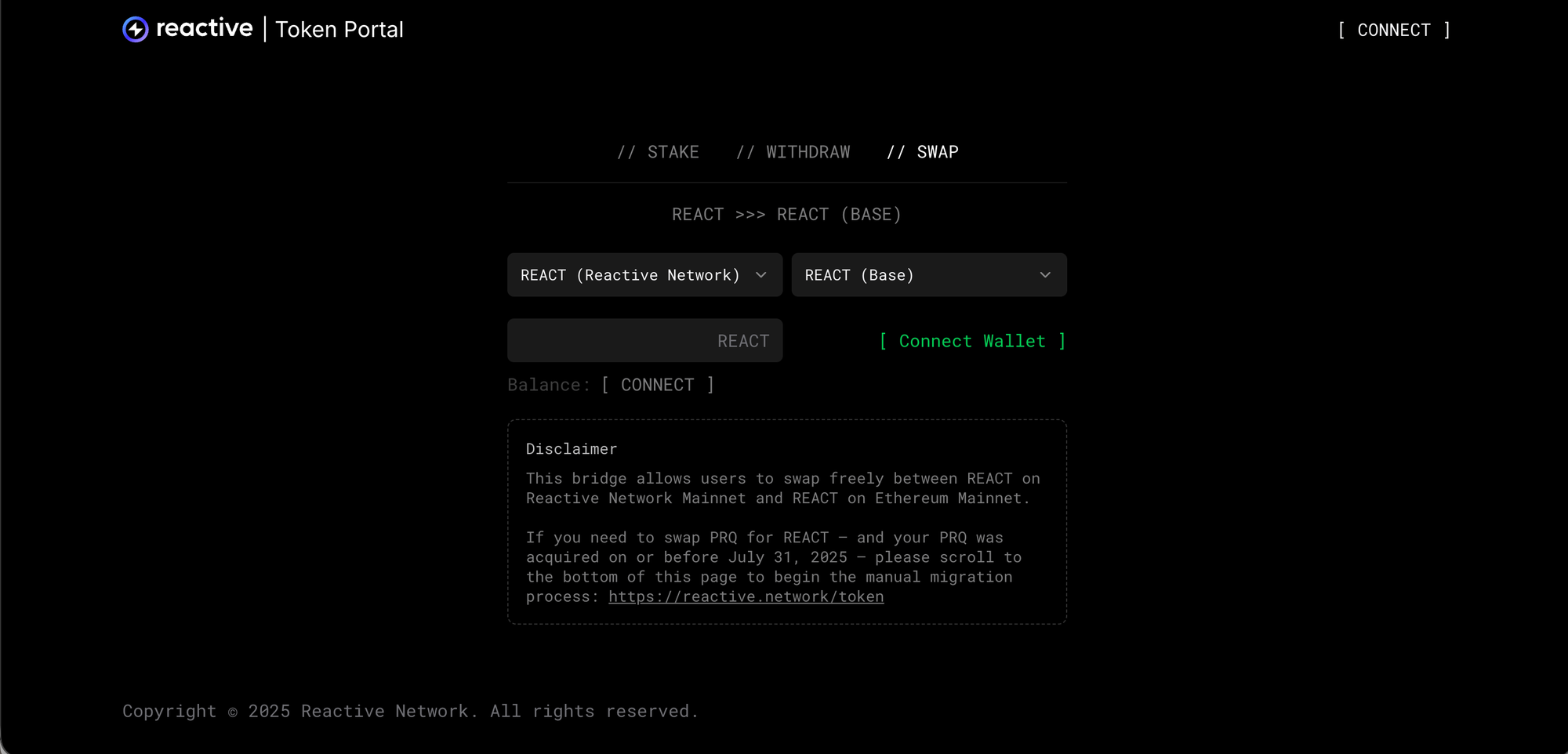 To facilitate efficient trading users can bridge easily and cost effectively to Base using our Reactive Token Portal. If you hold REACT (Ethereum) you'll first need to bridge to native REACT (Reactive Network) first before bridging over to REACT (Base).