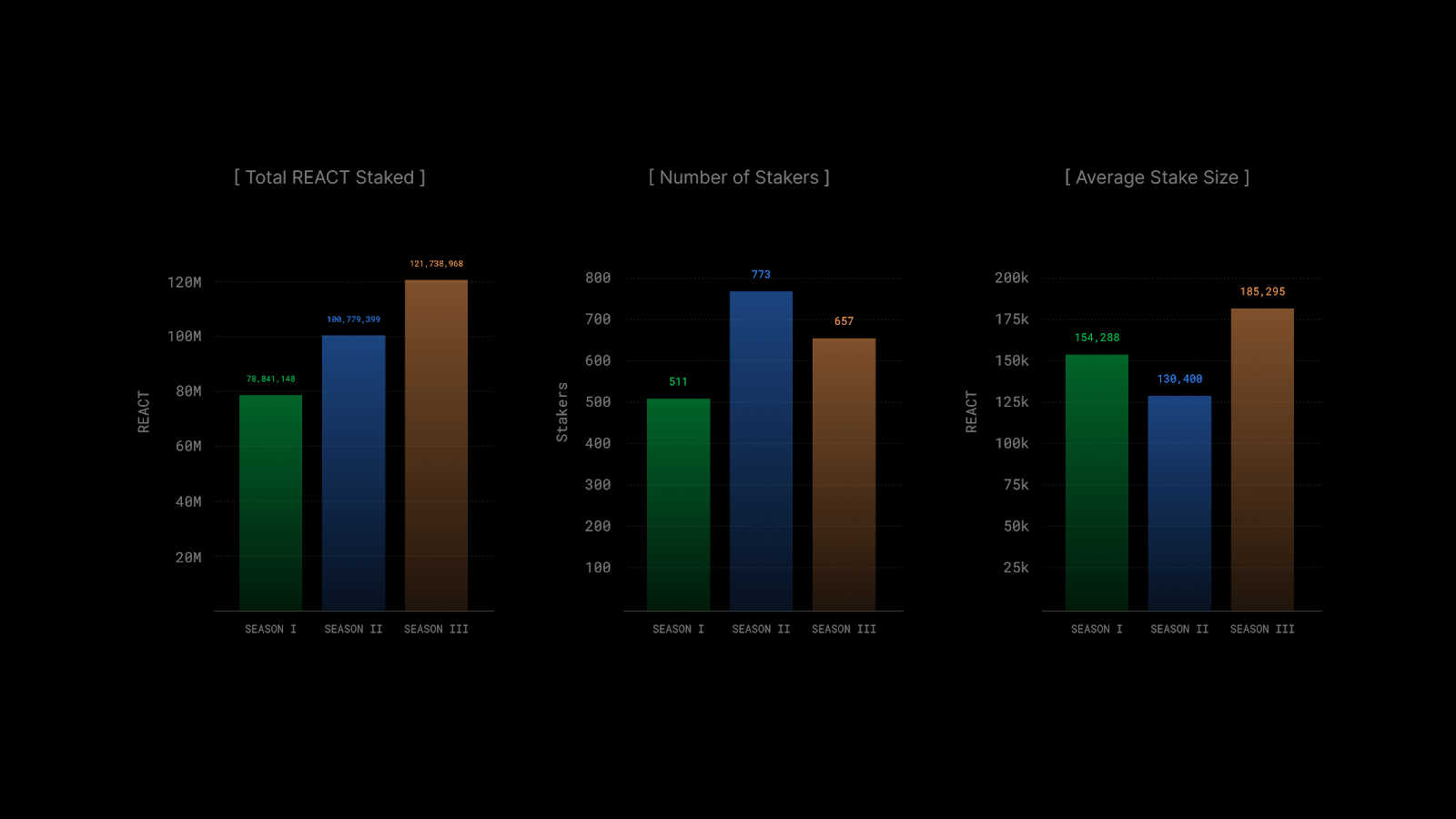 Season 3 kept the momentum alive. Total REACT staked hit an all-time high, and overall participation stayed strong: comfortably above Season 1 and trailing only slightly behind the record breaker that was Season 2. Interestingly, while Season 3 brought in fewer stakers than Season 2, the average stake size jumped, showing that those who participated leaned in more heavily.