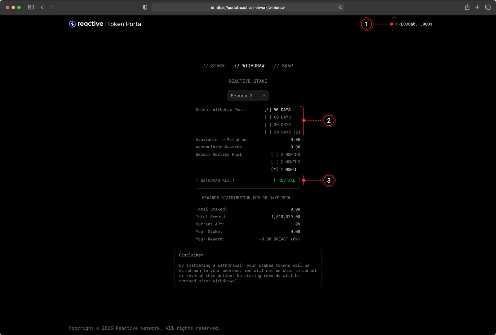 - Hit Restake and confirm the transaction to roll into Season 4.