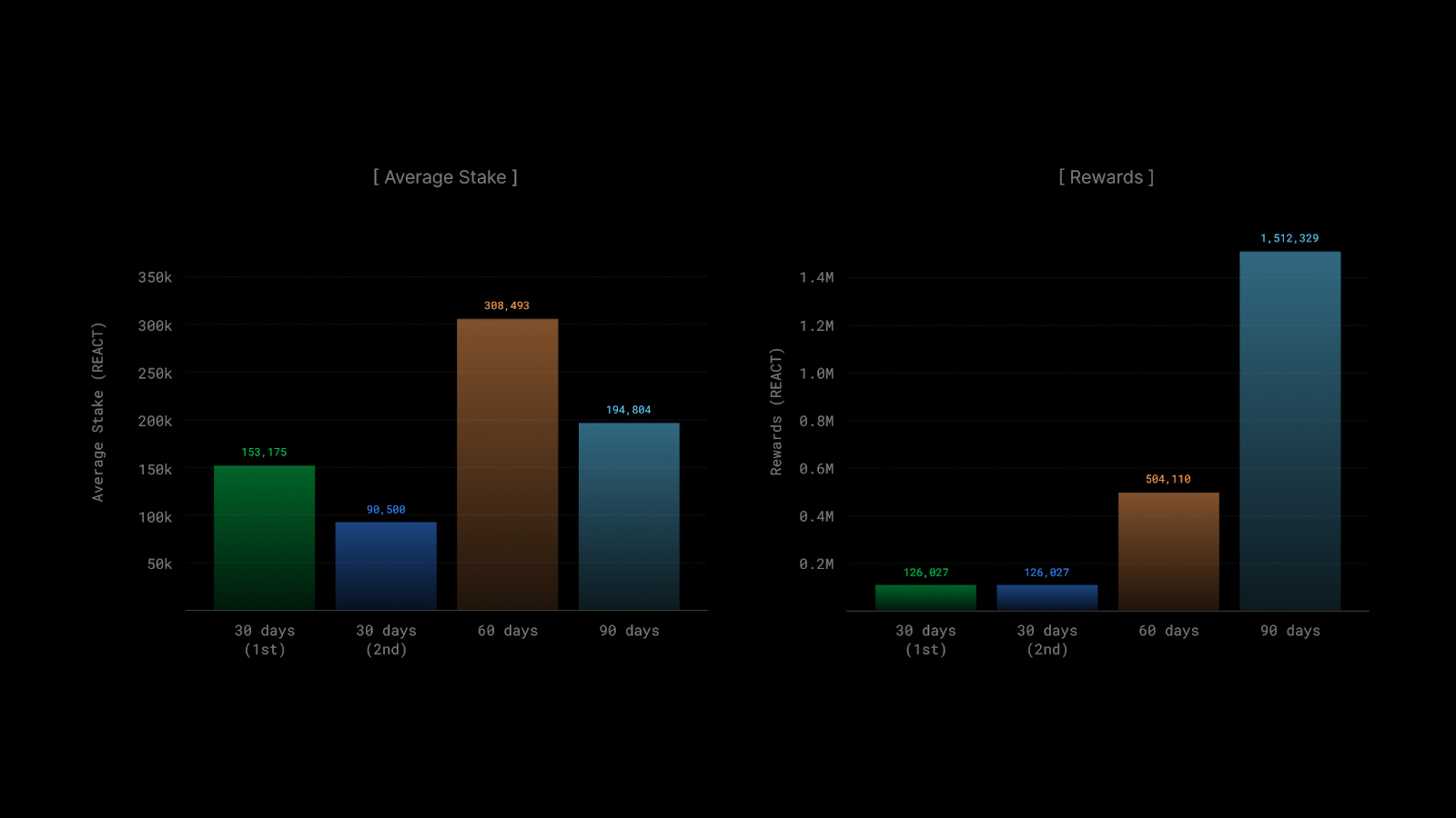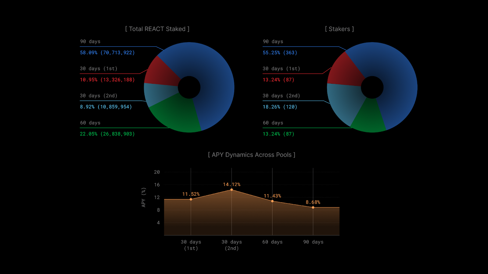 Rewards flowed along predictable lines. Longer pools walked away with the lion’s share simply because they carried the most REACT, while shorter pools, even with higher APYs, produced smaller totals due to lighter staking.