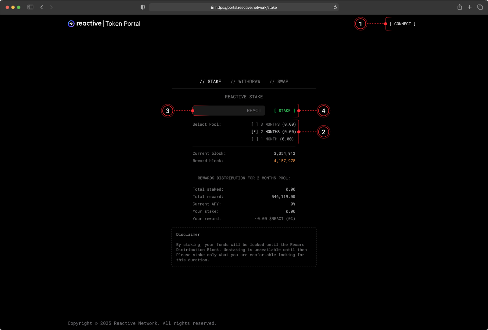 Once staked, your REACT remains locked for the full duration of the chosen pool. Principal + rewards unlock only when the pool concludes.