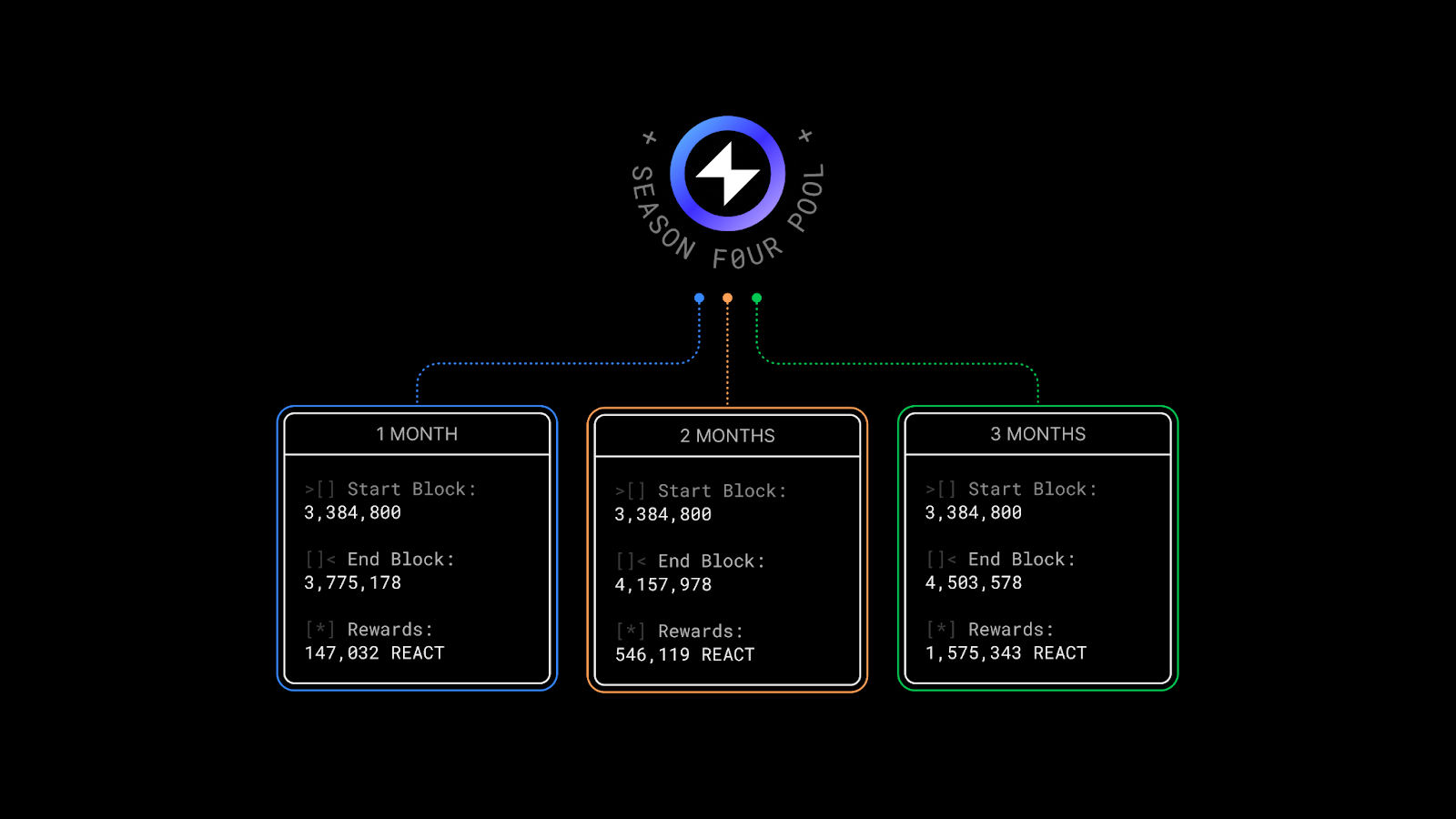 Then, without missing a beat, Season 4 launches at block 3,384,800, bringing a fresh reward pool of 2,268,494 REACT spread across three durations: